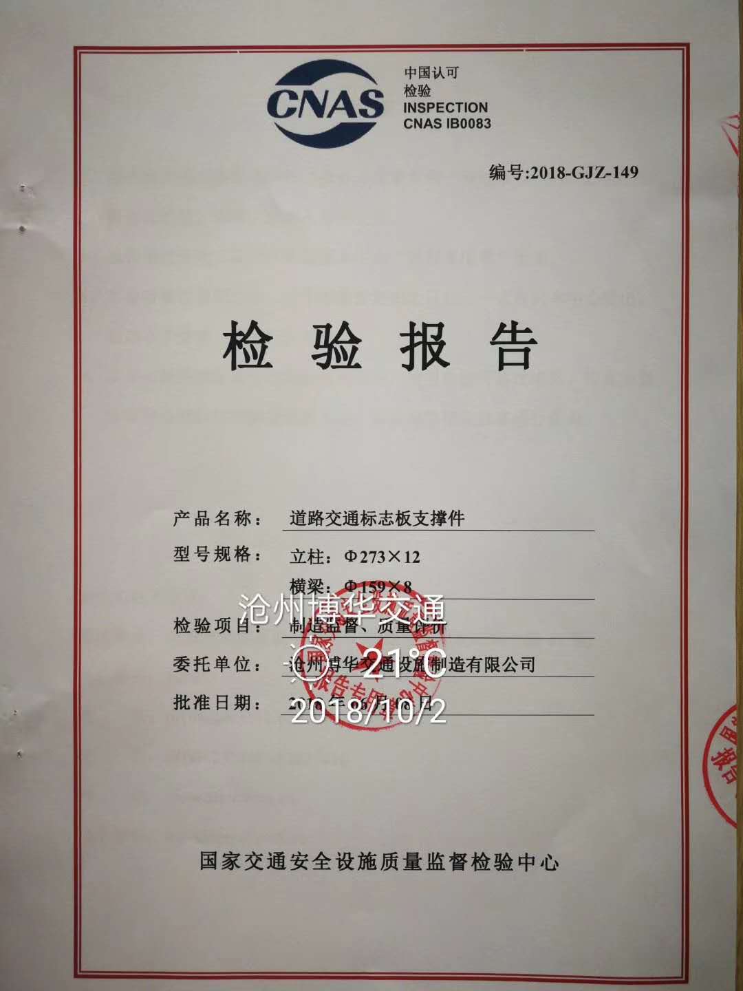 由省部級以上國家交通安全設施質量監督檢驗中心,于2018年驗廠、制造監督、產品抽檢、服務評價等一系列質量工序,全部合格后,頒發道路